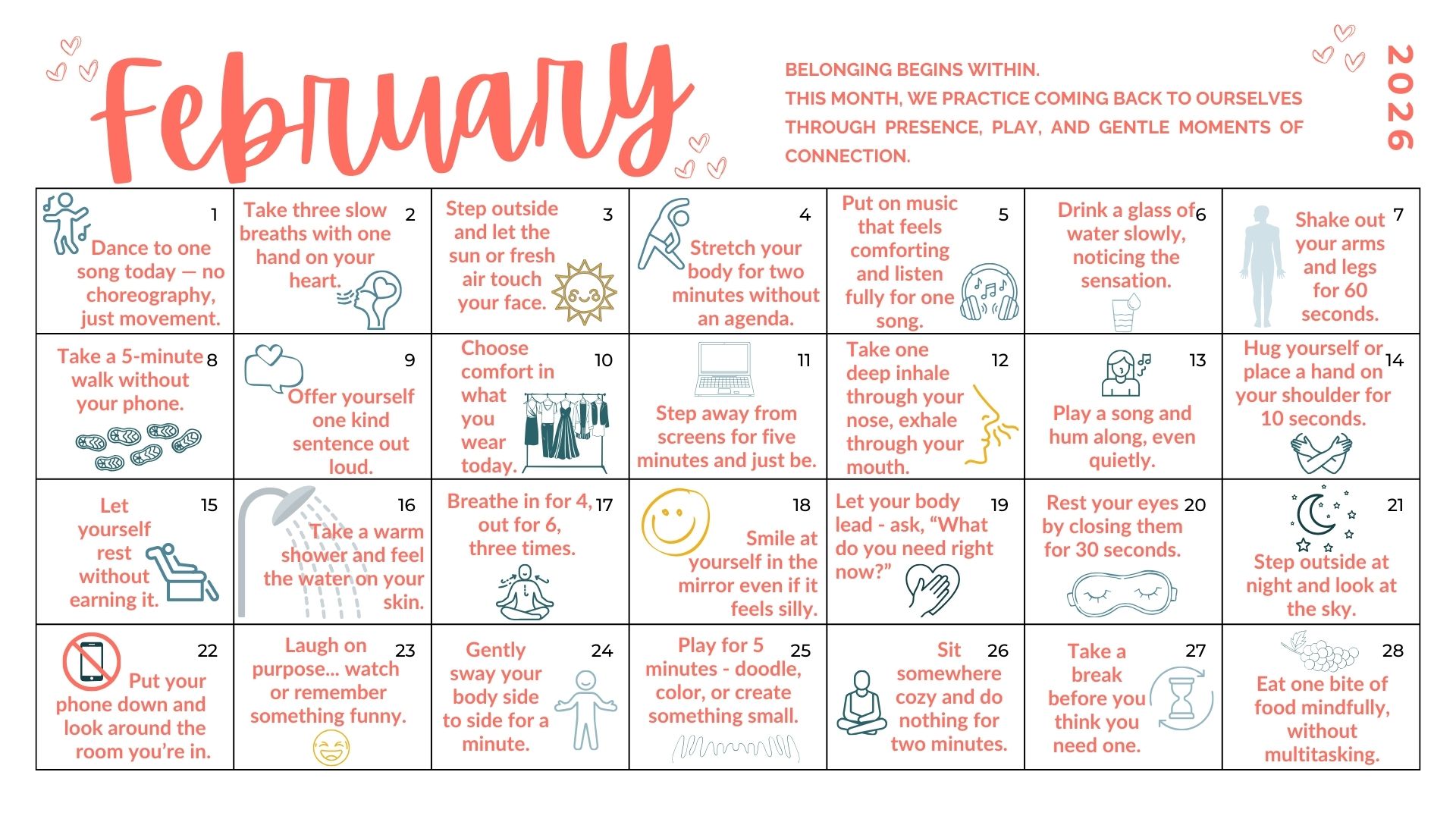 This February calendar is designed to support you in building a felt sense of belonging, not by doing more, but by listening more closely.